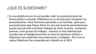 Slideshare es una plataforma para compartir presentaciones de forma pública o privada de manera similar a YouTube pero para presentaciones como PowerPoint. Los usuarios pueden comentar, compartir y puntuar presentaciones de otros, y los profesores y empresas a menudo usan Slideshare para compartir material educativo e informativo. La plataforma indexa bien en los buscadores y permite funciones como agregar video y audio a las presentaciones.