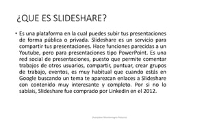 Slideshare es una plataforma para compartir presentaciones de forma pública o privada de manera similar a YouTube. Los usuarios pueden subir presentaciones de PowerPoint, agregar videos, imágenes y audio, y comentar y compartir el trabajo de otros. Slideshare se usa comúnmente para compartir contenidos educativos, casos de éxito, guías e infografías.