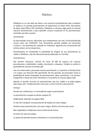 Slideshare es un sitio web que permite a los usuarios subir y compartir presentaciones de diapositivas, documentos y PDF de forma pública o privada. Ofrece herramientas como Slidecast que permite agregar narración o música a las presentaciones, y la posibilidad de incluir videos de YouTube. Permite almacenar archivos de hasta 20 MB con nombre, descripción y etiquetas, y compartirlos a través de enlaces de forma fácil en correos electrónicos, páginas web y blogs. Proporciona ventajas como dar conferencias sin