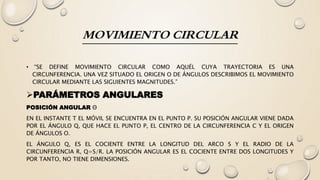 Este documento presenta información sobre el movimiento circular y sus características. Define conceptos como posición angular, desplazamiento angular, velocidad angular, aceleración angular, periodo y frecuencia. También describe las características del movimiento circular uniforme, incluyendo que la velocidad angular es constante, el vector velocidad es tangente a la trayectoria, y no hay aceleración angular o tangencial.