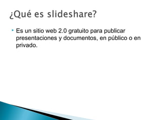 SlideShare es un sitio web gratuito lanzado en 2006 para publicar presentaciones y documentos de manera pública o privada, similar a YouTube pero orientado a presentaciones en diapositivas en lugar de videos. En 2012 fue adquirido por LinkedIn, permitiendo subir formatos como PDF, PPT, DOC entre otros. Los usuarios pueden crear una cuenta de LinkedIn para acceder, subir archivos arrastrándolos, y luego compartir, editar o ver estadísticas de sus publicaciones.
