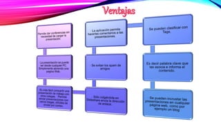 SlideShare es un sitio web para compartir presentaciones de diapositivas de manera pública o privada. Los usuarios pueden subir presentaciones en formatos como PowerPoint, PDF y Word. Cada diapositiva tiene su propia URL y permite comentarios. SlideShare es similar a YouTube pero para presentaciones y fue adquirido por LinkedIn en 2012. A nivel educativo, las presentaciones solo tienen valor si hay un presentador, aunque SlideShare permite agregar narraciones de audio.