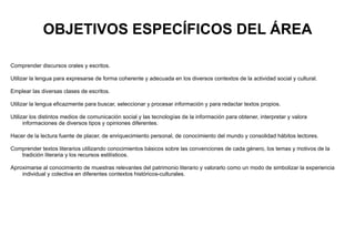 Este documento presenta los objetivos generales y específicos para el área de Lengua Castellana y Literatura en 4o de ESO. Los objetivos incluyen desarrollar hábitos de estudio y trabajo en equipo, rechazar estereotipos, y utilizar fuentes de información de manera crítica. También incluyen comprender y expresarse oralmente y por escrito, apreciar la cultura y el arte, y comprender textos literarios. La asignatura se dividirá en ocho sesiones entre explicaciones teóricas, actividades, b