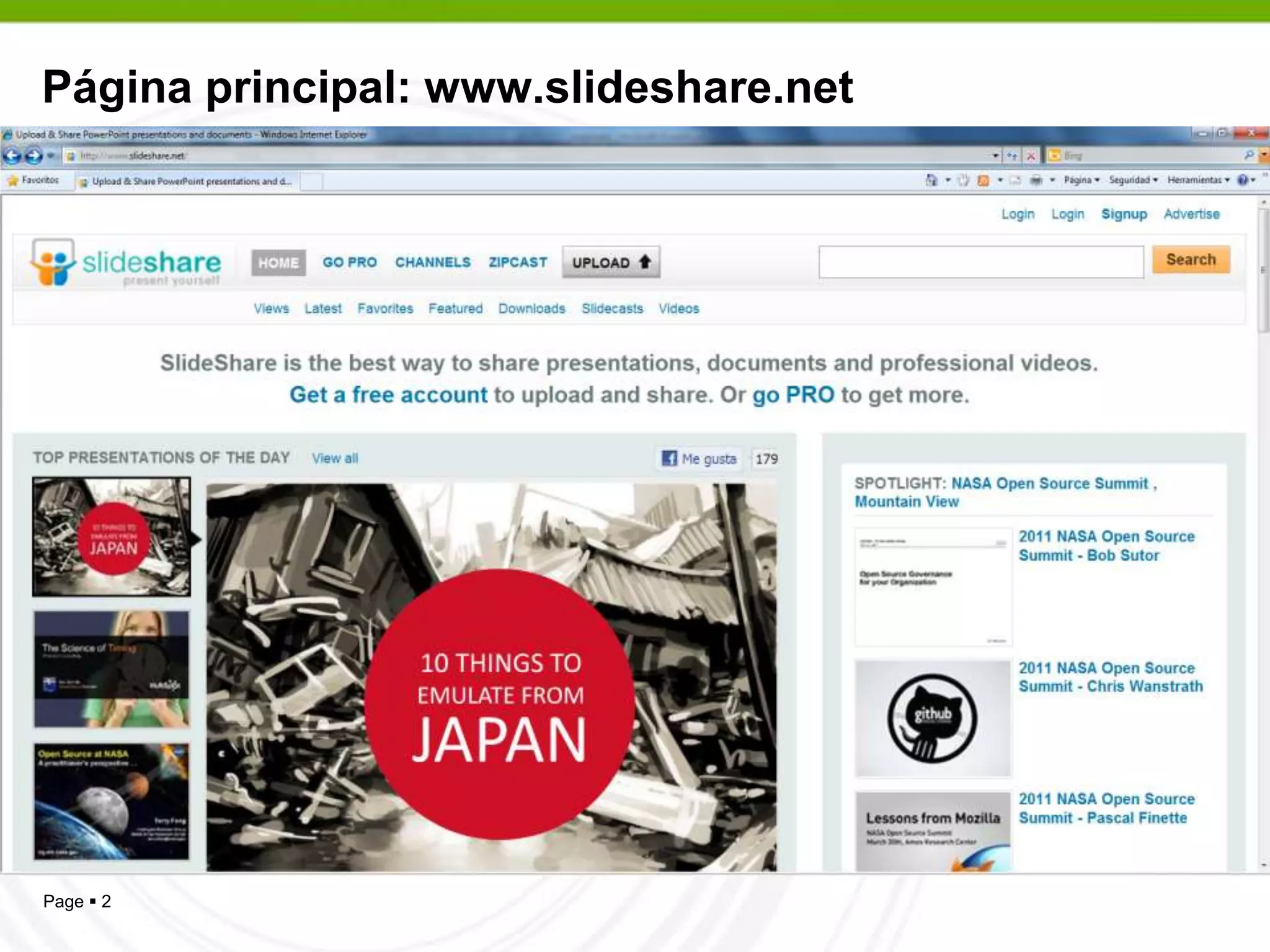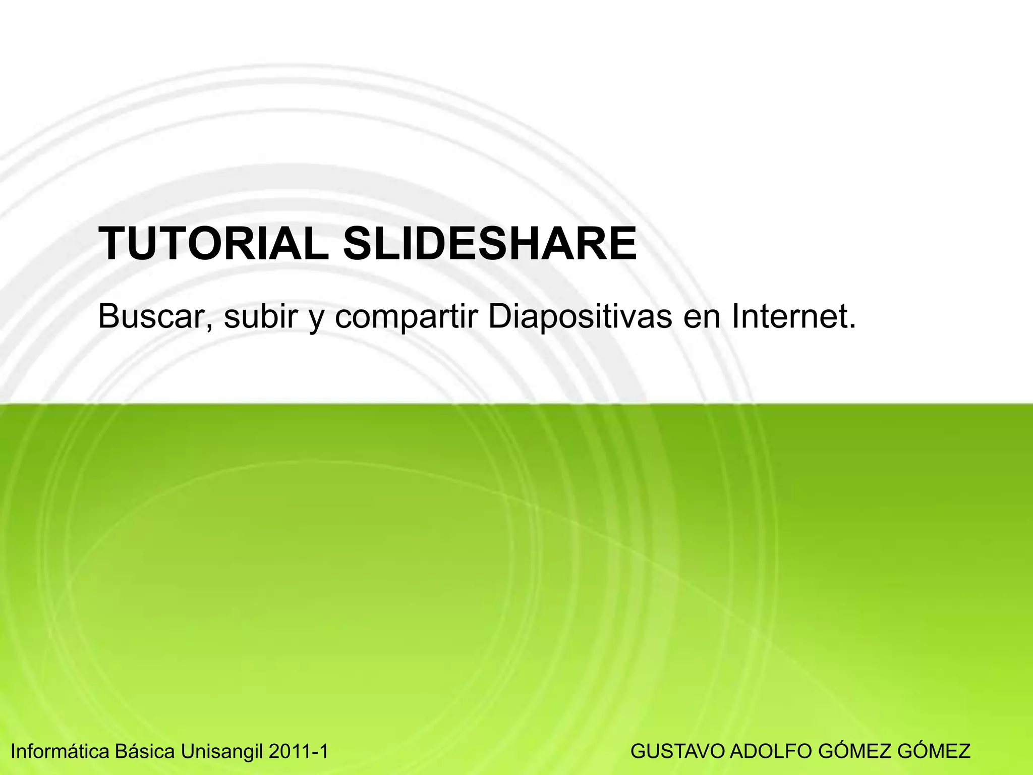 Este documento proporciona instrucciones sobre cómo registrarse en SlideShare de manera gratuita, subir diapositivas públicas o privadas, llenar metadatos como título, etiquetas y descripción, y compartir las diapositivas públicas a través de enlaces o correo electrónico. SlideShare permite buscar, subir y compartir presentaciones de diapositivas en línea de manera gratuita.