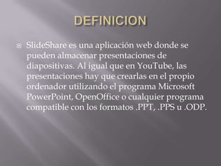 Slideshare es una aplicación web que permite almacenar y compartir presentaciones de diapositivas creadas en programas como PowerPoint. Se usa comúnmente con fines pedagógicos, permitiendo que profesores compartan materiales de clase con estudiantes. También es útil para empresas que desean compartir información con clientes y empleados. Proporciona ventajas como permitir dar presentaciones desde cualquier computadora solo con un enlace web, y facilitar el intercambio de presentaciones entre colegas. Sin embargo, tiene desventajas como limitar las presentaciones a un