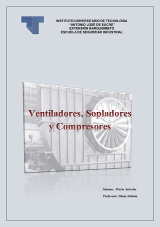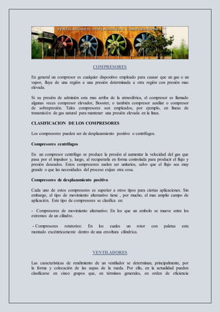 Los compresores son dispositivos que aumentan la presión de un gas. Existen dos tipos principales: compresores centrífugos y de desplazamiento positivo como los de movimiento alternativo o rotatorios. Los ventiladores mueven el aire y también se clasifican según la forma de sus aspas como de inclinación hacia atrás, axiales, de curvatura al frente o radiales. El aire comprimido se usa ampliamente en industrias y su distribución requiere conductos que pueden causar pérdidas por fricción u obstáculos