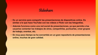 Slideshare es un servicio para compartir presentaciones en línea de manera similar a cómo YouTube comparte videos o Flickr fotos. Funciona también como una red social donde los usuarios pueden comentar, compartir y calificar las presentaciones de otros. Se ha convertido en un gran repositorio de presentaciones en línea, muchas de gran calidad. Ofrece herramientas adicionales como Slidecast para agregar narración o música y la posibilidad de integrar videos de YouTube.