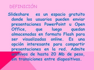 Slideshare es una plataforma gratuita para compartir presentaciones en formato Flash online. Los usuarios pueden subir presentaciones de PowerPoint o OpenOffice de hasta 20MB y Slideshare las convierte a formato Flash para verlas en línea. Las presentaciones se alojan en la dirección www.slideshare.net y se pueden compartir a través de enlaces o incorporar en páginas web. Para crear una cuenta, los usuarios deben completar un formulario de registro con su correo electrónico y contraseña.