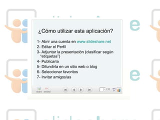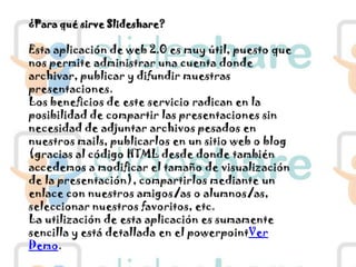 Slideshare es un servicio que permite publicar, ver y compartir presentaciones de PowerPoint, PDF u otros formatos. Los usuarios pueden crear una cuenta, cargar sus presentaciones y compartirlas a través de enlaces. Esto es útil para compartir presentaciones sin adjuntar archivos pesados en correos electrónicos o publicarlas en un sitio web o blog. Los usuarios también pueden ver las presentaciones de otros y marcar sus favoritas.