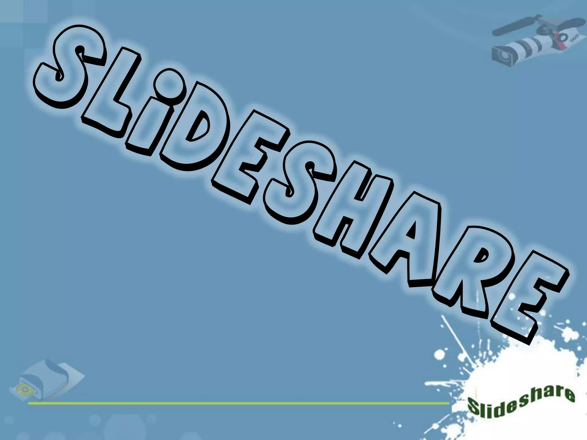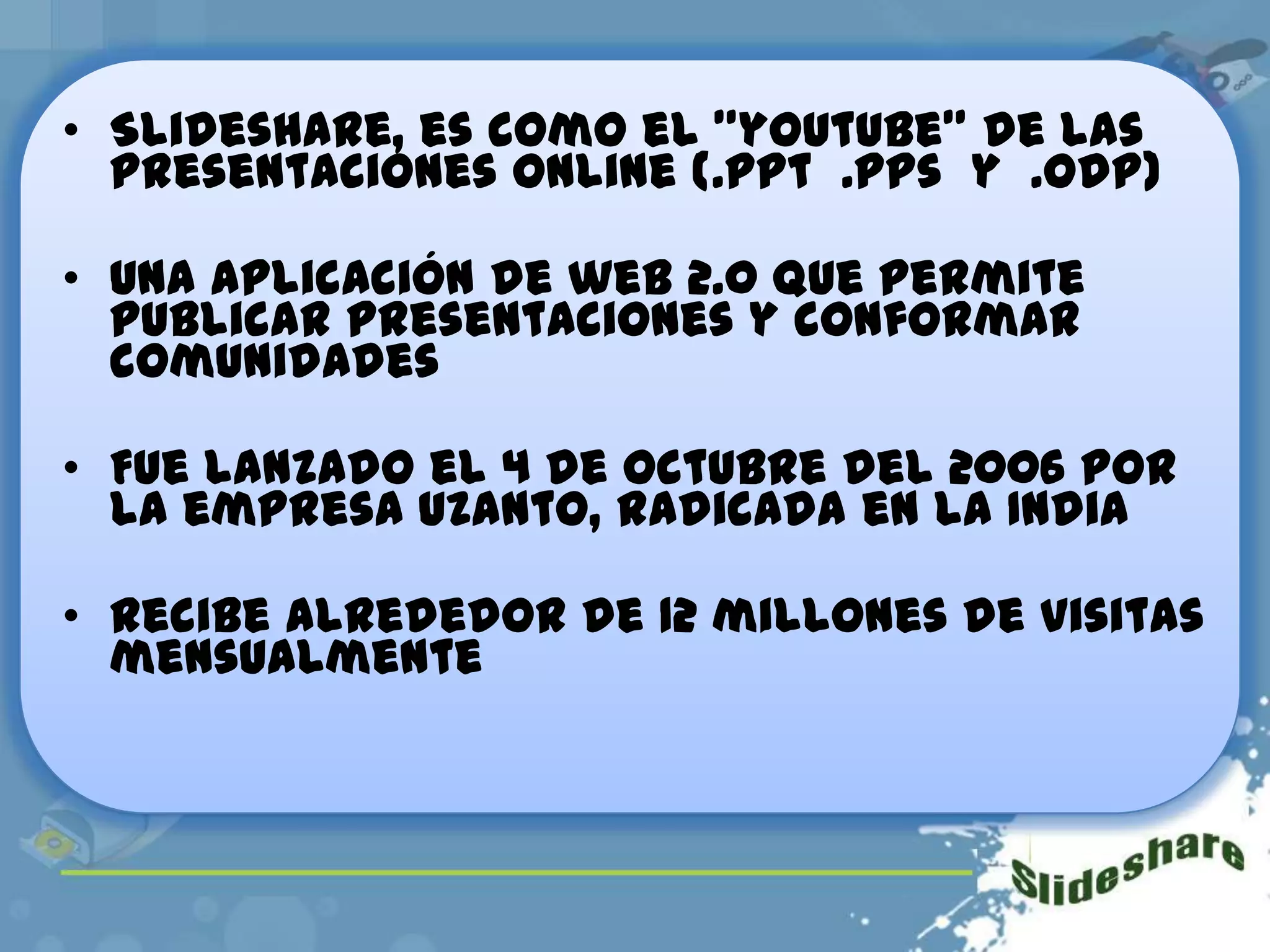 Slideshare es una plataforma web para compartir presentaciones de diapositivas de manera gratuita. Se lanzó en 2006 y recibe alrededor de 12 millones de visitas mensuales. Los usuarios pueden crear una cuenta, subir presentaciones en formato flash de hasta 20 MB, agregarles un título y descripción, y compartirlas o descargar las de otros. Slideshare también se puede usar para compartir otros tipos de contenidos como chistes, curiosidades, fotos, campañas políticas y religiosas.