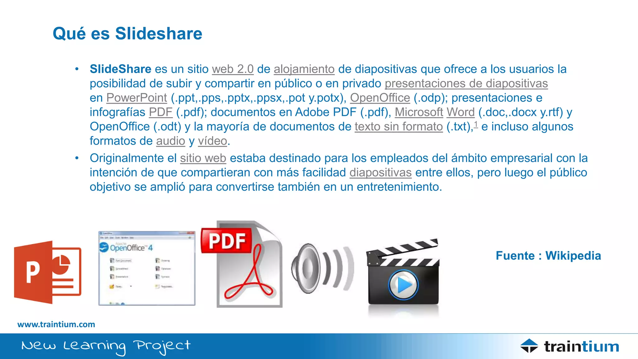 SlideShare es un sitio web que permite a los usuarios subir y compartir presentaciones en formatos como PowerPoint, PDF y Word. Originalmente estaba destinado a empleados para compartir presentaciones de forma fácil, pero luego se amplió para convertirse también en entretenimiento. Los usuarios pueden crear cuentas con correo electrónico, subir y editar presentaciones, añadir videos de YouTube, y compartirlas en redes sociales para promover marcas y realizar marketing.