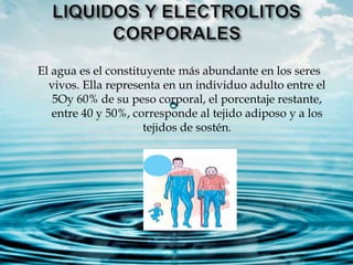 El documento describe los diferentes niveles de organización de la materia viva, desde el nivel subatómico hasta el nivel de biosfera. También describe la composición del agua corporal en humanos y cómo es regulada principalmente por los riñones a través de hormonas. Además, explica conceptos como osmolalidad, osmolaridad y homeostasis del agua en el organismo.