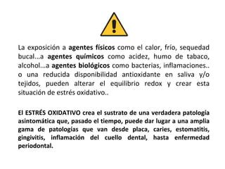 El documento describe la función antioxidante de la saliva y su importancia para la salud oral. Explica cómo el estrés oxidativo puede causar problemas como caries y enfermedades periodontales, y cómo la saliva ayuda a combatirlo a través de sustancias antioxidantes. También describe tres pruebas (SAT, d-ROMs, BAP) que miden la capacidad antioxidante de la saliva y la sangre, y cómo interpretar sus resultados para evaluar el riesgo de problemas orales y determinar el tratamiento apropiado.