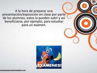 Slideshare permite a los estudiantes subir sus presentaciones para que otros puedan acceder a ellas y estudiar, compartiendo ideas y recursos sin ocupar espacio en sus equipos.