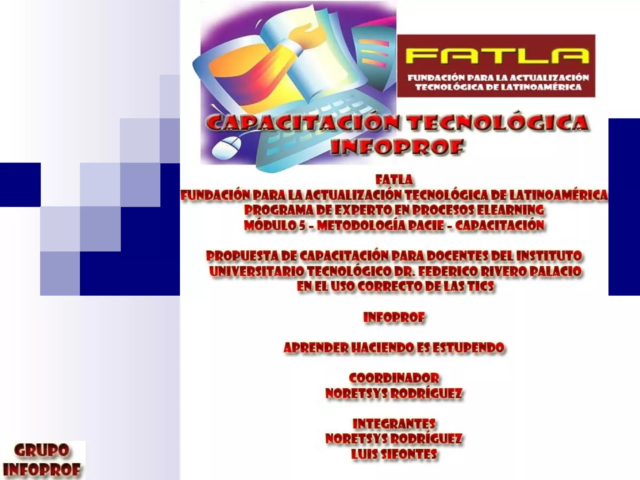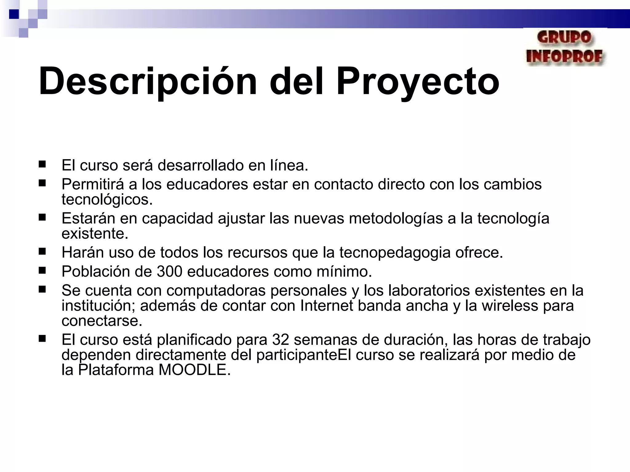 Este documento describe una propuesta de capacitación docente en el uso de las TIC para 300 educadores de un instituto universitario. El curso de 8 meses se desarrollará en línea a través de Moodle e incluirá módulos sobre herramientas tecnológicas como wikis, foros y blogs. La capacitación busca actualizar a los docentes sobre nuevas metodologías y el uso pedagógico de recursos digitales para mejorar el aprendizaje de los estudiantes.
