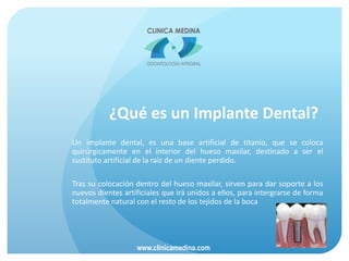 Los implantes dentales son estructuras de titanio colocadas en el hueso maxilar para reemplazar raíces de dientes perdidos, mejorando función, estética y salud dental. El tratamiento incluye fases quirúrgicas, restauradoras y de mantenimiento, y debe ser realizado por profesionales capacitados, considerando las condiciones individuales de cada paciente. Pese a su alta tasa de éxito, pueden presentarse complicaciones como infecciones y movimiento del implante.