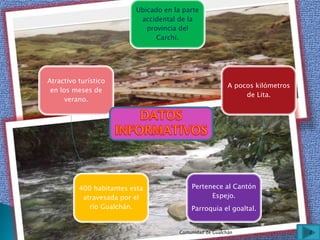 La comunidad de Gualchán se encuentra en la provincia de Carchi, a pocos kilómetros de Lita. Tiene alrededor de 400 habitantes y está atravesada por el río Gualchán. Celebra fiestas el 5 de abril en honor a su patrono San Vicente Ferrer y ofrece atractivos turísticos en los meses de verano cuando los jóvenes y niños se reúnen en los vados del río. Sus principales actividades económicas son la agricultura, ganadería y en menor grado la piscicultura, también produ