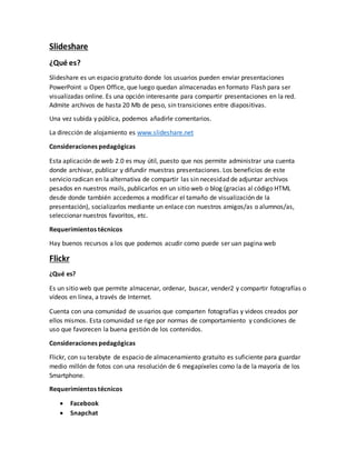 Slideshare es un sitio web gratuito donde los usuarios pueden subir presentaciones en formato PowerPoint o OpenOffice para compartirlas en línea sin pesados archivos adjuntos. Una vez publicadas, las presentaciones pueden verse en formato Flash, añadir comentarios y compartirse a través de enlaces. Flickr es un sitio para almacenar, organizar, buscar, vender y compartir fotografías y videos en línea a través de Internet, con una comunidad de usuarios que comparten sus propios contenidos siguiendo normas de comportamiento.