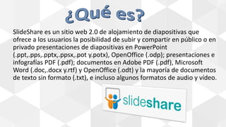 Slideshare es una plataforma de alojamiento y compartición de presentaciones que permite subir y compartir varios formatos de documentos y multimedia. Lanzada en 2006 y adquirida por LinkedIn en 2012, la plataforma ha evolucionado con nuevas herramientas y funciones para professionalizar la experiencia del usuario, atrayendo a 70 millones de usuarios mensuales activos. Entre sus características se encuentran la función Zipcast para conferencias en línea y Clipping para guardar diapositivas individuales de presentaciones.