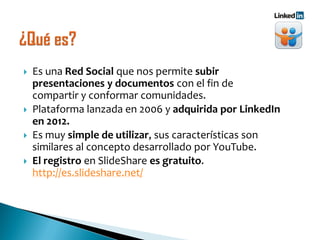 Slideshare es una red social lanzada en 2006 que permite compartir presentaciones y documentos, ofreciendo características similares a YouTube. Los usuarios pueden registrar gratuitamente, buscar contenido, publicar y descargar documentos, así como medir sus interacciones mediante herramientas analíticas. La plataforma es útil para potenciar la presencia online y ayudar en el marketing de contenido, facilitando la creación y promoción de marca personal y empresarial.