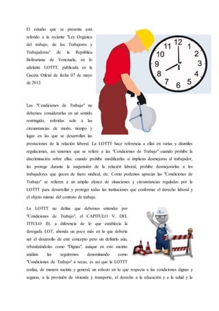 Este documento resume la Ley Orgánica del Trabajo de Venezuela. Explica que la ley se refiere a las "condiciones de trabajo" en varias secciones aunque no las define específicamente. Las condiciones de trabajo incluyen más que solo el lugar, tiempo y modo en que se realiza el trabajo. La ley establece principios generales sobre condiciones dignas y seguras de trabajo, así como vivienda, transporte, educación, salud y protección contra acoso. Luego, la ley desarrolla más las instituciones de la jornada laboral,