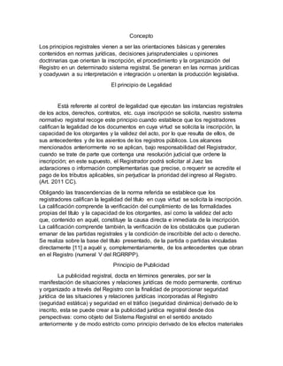 2) El principio de legalidad establece que los registradores califican la legalidad de los documentos presentados para inscripción.