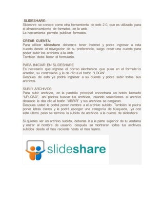 Slideshare es una herramienta web 2.0 para almacenar y publicar presentaciones y otros archivos en formato digital. Para usar Slideshare, los usuarios deben crear una cuenta ingresando su correo electrónico y contraseña, luego pueden subir archivos seleccionándolos y completando la información requerida como nombre, palabras clave y categoría. Una vez subidos, los archivos estarán disponibles para que otros usuarios los vean.