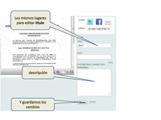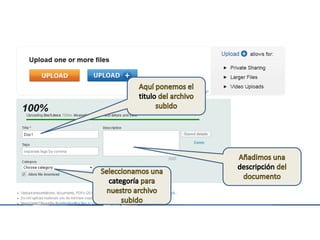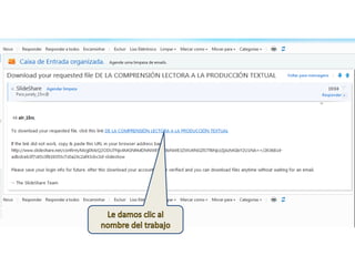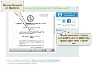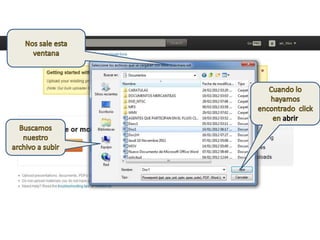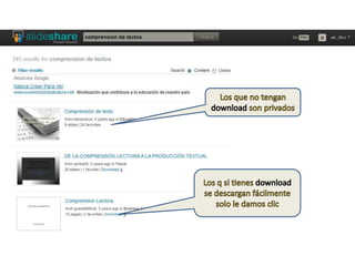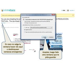 El documento explica cómo crear una cuenta en SlideShare para subir diapositivas a un blog. Detalla los pasos para iniciar sesión en una cuenta de Gmail y luego en SlideShare, seleccionar un tema, encontrar diapositivas relevantes de otros usuarios y descargarlas después de revisarlas, abrirlas y guardarlas en la computadora.