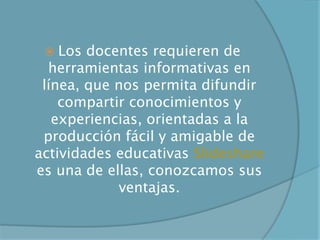 Este documento describe las ventajas de usar Slideshare, una herramienta en línea que permite compartir presentaciones. Algunas ventajas clave son que permite dar conferencias sin cargar la presentación, compartir presentaciones fácilmente con colegas, enviar presentaciones grandes que no cabrían por correo, y permitir que múltiples personas vean presentaciones de manera pública al mismo tiempo. El documento también incluye un enlace a un tutorial sobre cómo usar Slideshare de manera fácil.