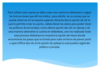 Slideshare es un sitio web gratuito donde los usuarios pueden subir presentaciones en formato PowerPoint u OpenOffice para compartirlas en línea en formato Flash. Los archivos pueden tener hasta 20 MB y, una vez subidos, están disponibles a través de una dirección web pública sin opciones de privacidad. Slideshare también permite compartir las presentaciones a través de correo electrónico o incrustarlas en páginas web, y los usuarios pueden añadir comentarios a las presentaciones públicas.