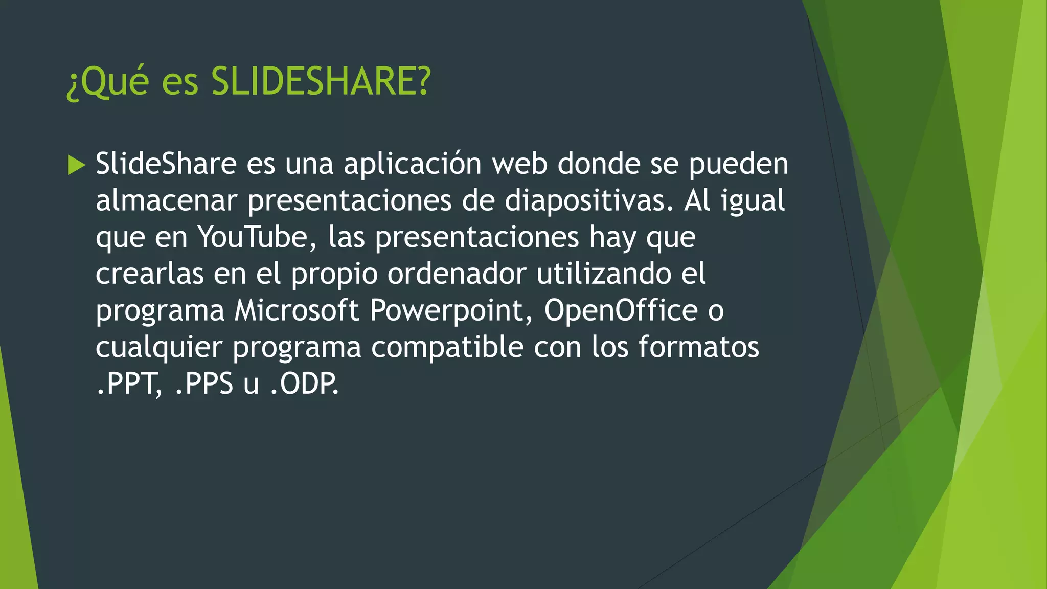 SlideShare es una aplicación web donde se pueden almacenar presentaciones de diapositivas creadas en programas como PowerPoint. Para crear una cuenta, los usuarios deben registrarse completando sus datos personales y confirmando la inscripción a través de un correo electrónico. Una vez registrados, pueden subir sus presentaciones agregando un título, descripción y palabras clave, y configurar su publicación como privada o pública. También pueden copiar el código HTML de una presentación para incrustarla en otro sitio web como un blog.