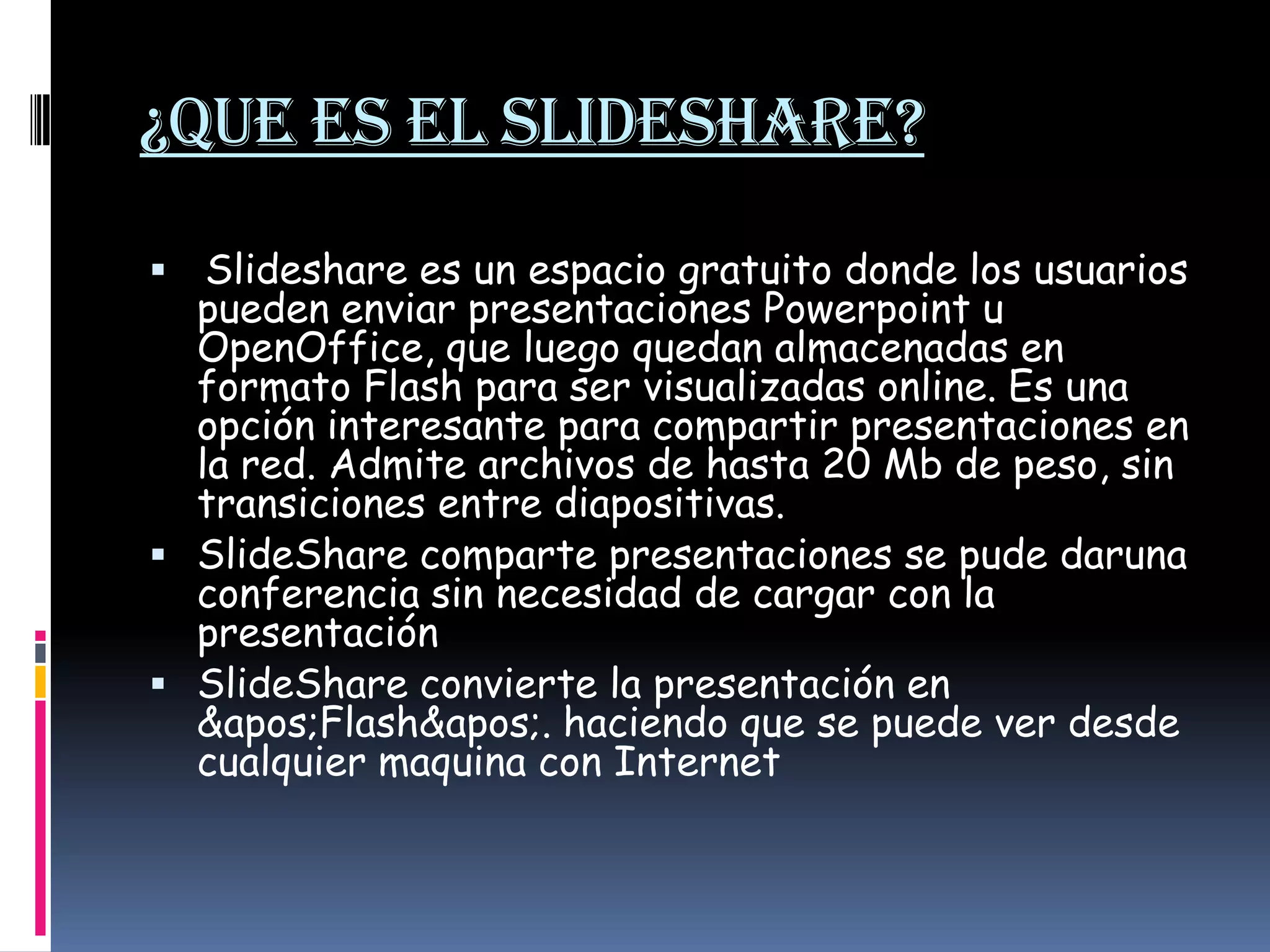 Slideshare es un sitio web gratuito donde los usuarios pueden subir presentaciones en formato PowerPoint u OpenOffice para compartirlas en línea. Las presentaciones se convierten a formato Flash para poder verse desde cualquier dispositivo con acceso a Internet. Para crear una cuenta, los usuarios completan un formulario de registro e ingresan su correo electrónico para activar la cuenta. Una vez creada la cuenta, los usuarios pueden subir presentaciones completando información como etiquetas y descripción para hacerlas más fáciles de encontrar.
