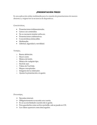 Este documento presenta varias herramientas digitales para la creación de contenidos en línea como Prezi, Blogger, Canva, Cacoo, Slideshare, Google Docs y Wiki. Se describen sus características principales, ventajas, desventajas y cómo crear contenidos con cada una de ellas.