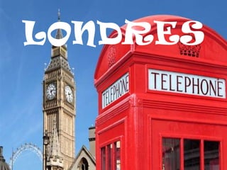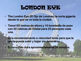 El documento presenta información sobre varios importantes lugares de Londres, incluyendo el London Eye, una noria gigante; Big Ben, la famosa campana en la Torre del Reloj del Parlamento; el Palacio de Buckingham, residencia de la familia real; la Catedral de San Pablo, con su llamativa decoración; el Puente de la Torre, un puente levadizo construido en estilo victoriano; la Torre de Londres, antigua fortaleza y prisión real; y otros lugares como el Palacio de Kensington, Piccadilly Circus, Trafal