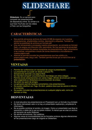 Slideshare es un servicio para compartir presentaciones de diapositivas en línea de manera similar a cómo YouTube comparte videos y Flickr comparte fotografías. Permite almacenar archivos de presentaciones de hasta 20 MB con nombre, descripción y etiquetas, y las convierte a formato flash con una URL permanente para que puedan ser buscadas, comentadas y compartidas a través de correo electrónico o incrustadas en páginas web.