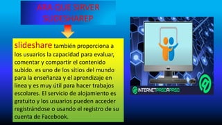 SlideShare es un sitio web que permite a los usuarios subir, ver, compartir y comentar presentaciones de diapositivas, documentos y PDF. Los usuarios pueden acceder de forma gratuita registrándose o con su cuenta de Facebook. SlideShare proporciona una forma fácil y flexible de compartir contenido y aprender en línea.