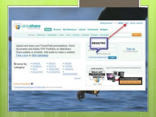 Slideshare es una aplicación web donde los usuarios pueden almacenar y compartir presentaciones de PowerPoint u otros formatos como PDF. Los usuarios necesitan crear una cuenta en slideshare.net para subir presentaciones. Slideshare ofrece las ventajas de permitir dar conferencias en línea sin necesidad de cargar la presentación, verla desde cualquier dispositivo y embeberla en blogs.
