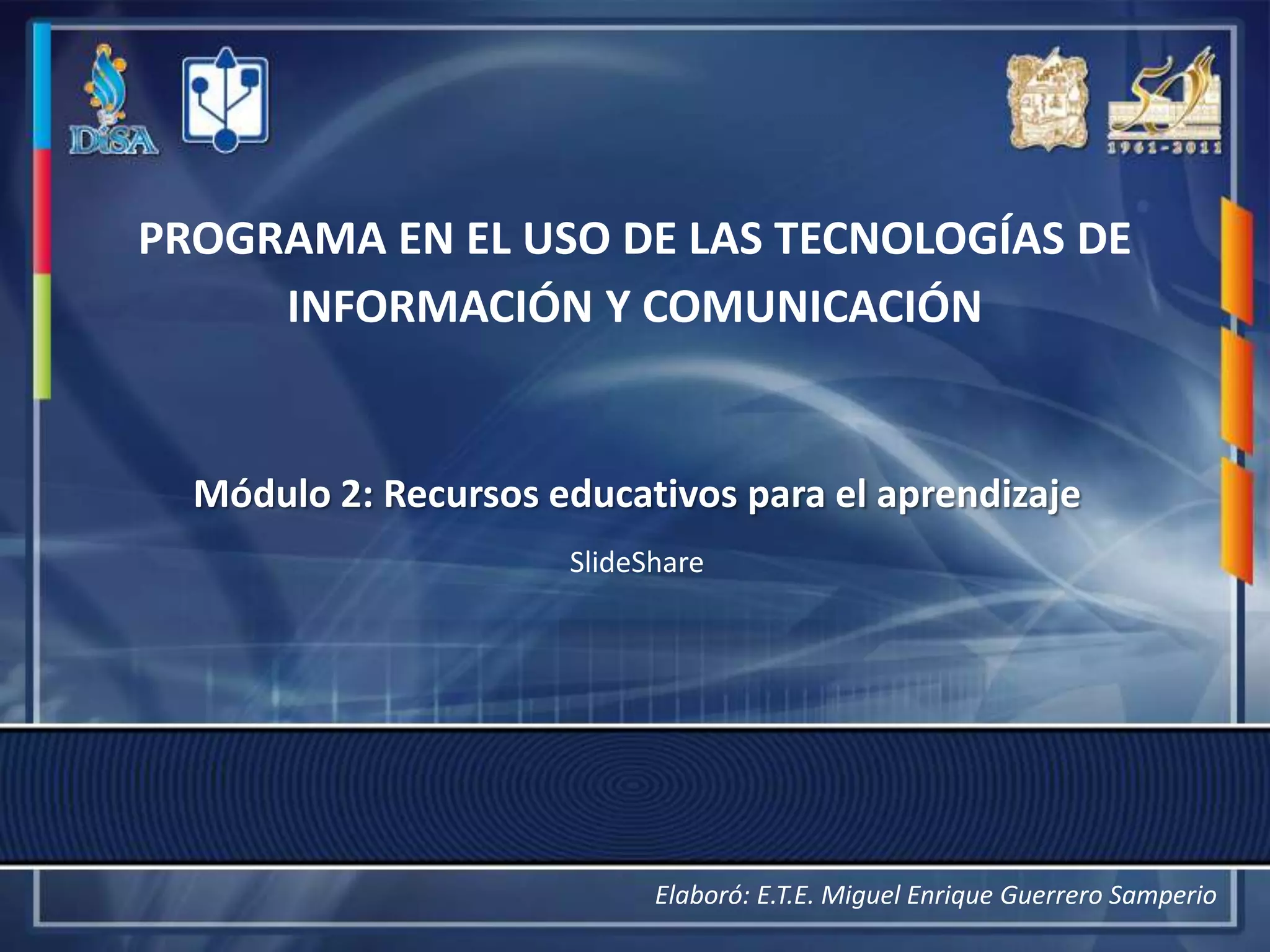 SlideShare es un repositorio en línea para presentaciones electrónicas que permite a los usuarios registrarse, subir sus presentaciones y compartirlas a través de enlaces o correo electrónico. Los usuarios pueden ver presentaciones clasificadas por popularidad y fecha, y SlideShare facilita la inserción de presentaciones en blogs y wikis. Para usar SlideShare, los usuarios deben crear una cuenta y luego pueden subir archivos en formatos compatibles como PowerPoint.