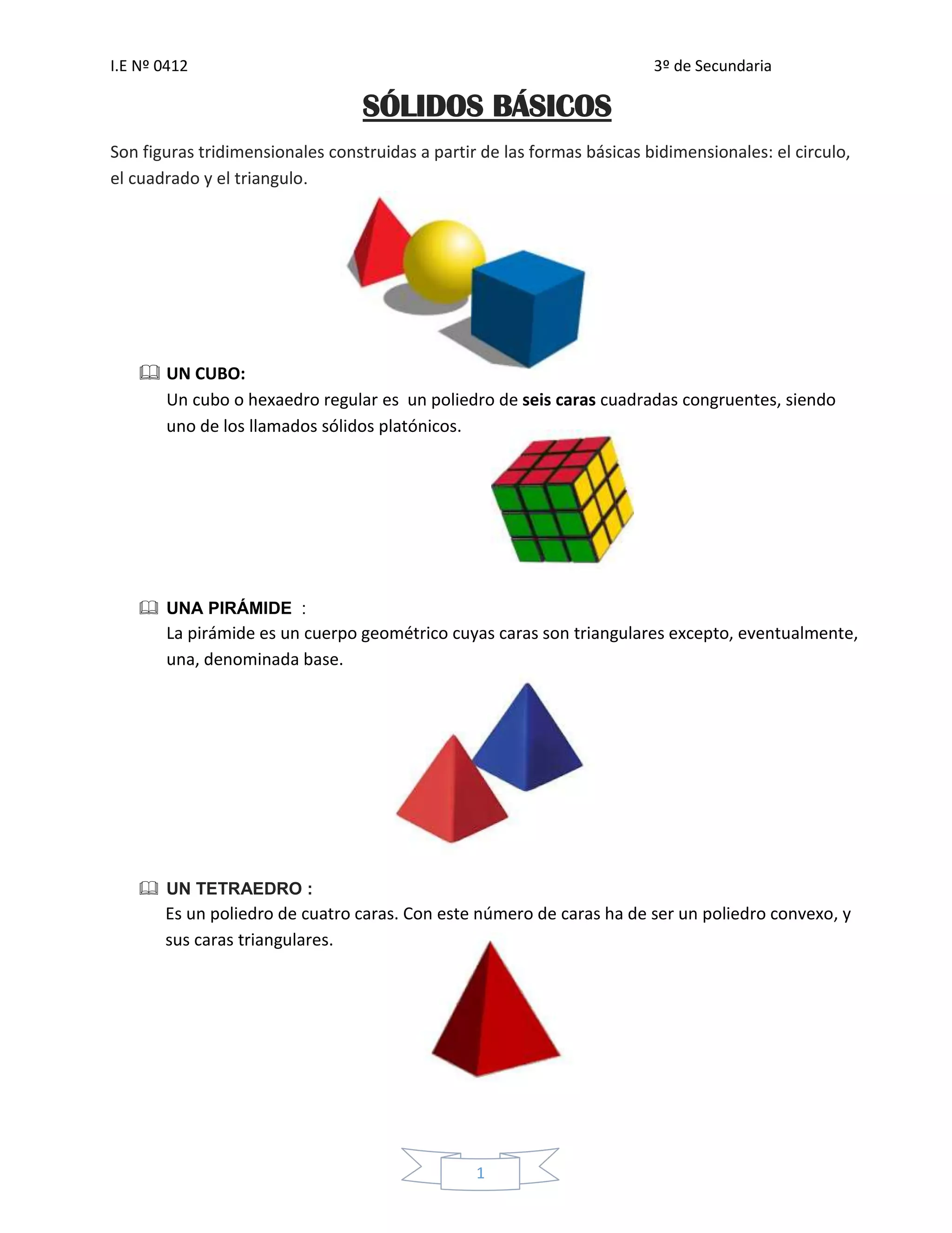 Este documento describe los sólidos básicos tridimensionales: un cubo, una pirámide, un tetraedro, un cono, una esfera y un cilindro. Define cada uno de estos sólidos y sus características geométricas fundamentales, como las caras cuadradas de un cubo, las caras triangulares de una pirámide (excepto la base), las cuatro caras triangulares de un tetraedro, las dos superficies cónicas de un cono, y la forma generada por el movimiento paralelo de una rect