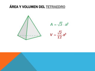 Este documento presenta fórmulas para calcular el área y volumen de varias figuras geométricas tridimensionales y bidimensionales comunes, incluyendo el tetraedro, octaedro, icosaedro, dodecaedro, cubo, ortoedro, prisma, pirámide, tronco de pirámide, cilindro, cono y esfera.