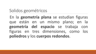 El documento describe diferentes tipos de sólidos geométricos tridimensionales como poliedros y cuerpos redondos. Explica las características de un cubo, incluyendo que está formado por 6 cuadrados iguales y tiene 6 caras, 8 vértices y 12 aristas. También presenta ejemplos de cálculos de volumen y costo de pintar una piscina.