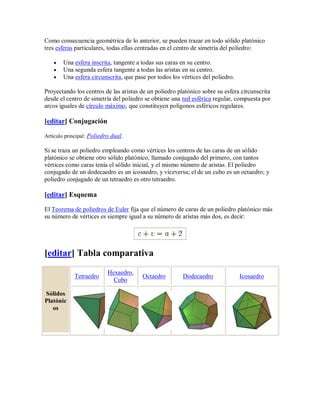 Los sólidos platónicos son los únicos poliedros que tienen caras regulares iguales y en los que el mismo número de caras se unen en cada vértice. Los cinco sólidos platónicos son el tetraedro, el cubo, el octaedro, el dodecaedro y el icosaedro. Cada sólido platónico tiene propiedades únicas de simetría y regularidad.