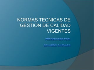 Este documento describe las normas técnicas de gestión de calidad vigentes, incluyendo la norma ISO 9000. Explica que la gestión de calidad consiste en manejar el desempeño de una organización para proporcionar productos y servicios que satisfagan las necesidades de los clientes. También describe las ventajas e inconvenientes de implementar estas normas, así como algunas normas técnicas colombianas específicas relacionadas con la calidad.