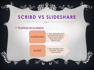 Este documento compara las páginas web Scribd y SlideShare. Scribd se enfoca en compartir y buscar documentos de cualquier tamaño, mientras que SlideShare se enfoca en presentaciones educativas y laborales de hasta 100MB gratis o 300MB premium. Ambas permiten subir archivos de Office, PDF y videos. El proceso de subida es sencillo en las dos páginas. SlideShare integra mejor con redes sociales y ofrece estadísticas semanales.