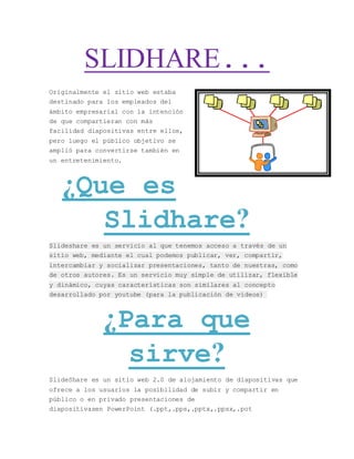 Originalmente, Slideshare fue creado para que empleados compartieran presentaciones entre sí más fácilmente, pero luego se expandió para entretener al público en general al permitir que usuarios suban y compartan presentaciones pública o privadamente en diversos formatos.