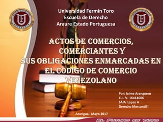 El documento resume los principales conceptos relacionados con los actos de comercio según el derecho mercantil venezolano. Explica que los actos de comercio se clasifican en objetivos, subjetivos y mixtos, y describe cada categoría. También define qué es un comerciante y enumera algunas de las obligaciones legales que tienen los comerciantes de acuerdo al Código de Comercio venezolano.