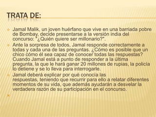 Jamal, un joven huérfano de Bombay, llega a la última pregunta del concurso "¿Quién quiere ser millonario?" con la posibilidad de ganar 20 millones, pero es detenido por la policía bajo sospecha de fraude. Jamal explica que conoce las respuestas gracias a momentos clave de su vida, incluyendo la amistad con Latika de quien está enamorado, aunque ella ahora esté casada con un mafioso. Tras narrar su historia, se le permite volver al concurso donde acierta la