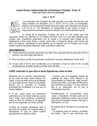 La fiesta de la Santísima Trinidad nos invita a vivir en comunión con Dios como Padre, Hijo y Espíritu Santo. El documento explora el misterio de la Trinidad a través de las enseñanzas de Jesús y los escritos de Juan, destacando que Dios nos ama y nos ofrece vida eterna a través de su Hijo, y nos guía a través de su Espíritu Santo. Finalmente, nos invita a reflejar la perfección de la comunión trinitaria en nuestras propias vidas
