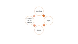 El documento describe una estructura organizativa con un director general, una dirección secundaria y una dirección de primaria que supervisan a diferentes profesores. También se mencionan las etapas del cultivo de un cereal, los pasos para obtener una licencia de conducir y las diferentes clases sociales de una sociedad.