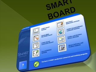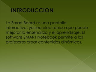 La Smart Board es una pantalla interactiva que puede mejorar la enseñanza y el aprendizaje mediante el uso de software como SMART Notebook, que permite a los profesores crear contenidos dinámicos. El software también permite grabar presentaciones, establecer la calidad y formato de la grabación, y seleccionar la ubicación de almacenamiento. Adicionalmente, incluye herramientas como un reproductor de video, herramientas flotantes de fácil acceso, una sombra de pantalla para ocultar el escritorio, y una